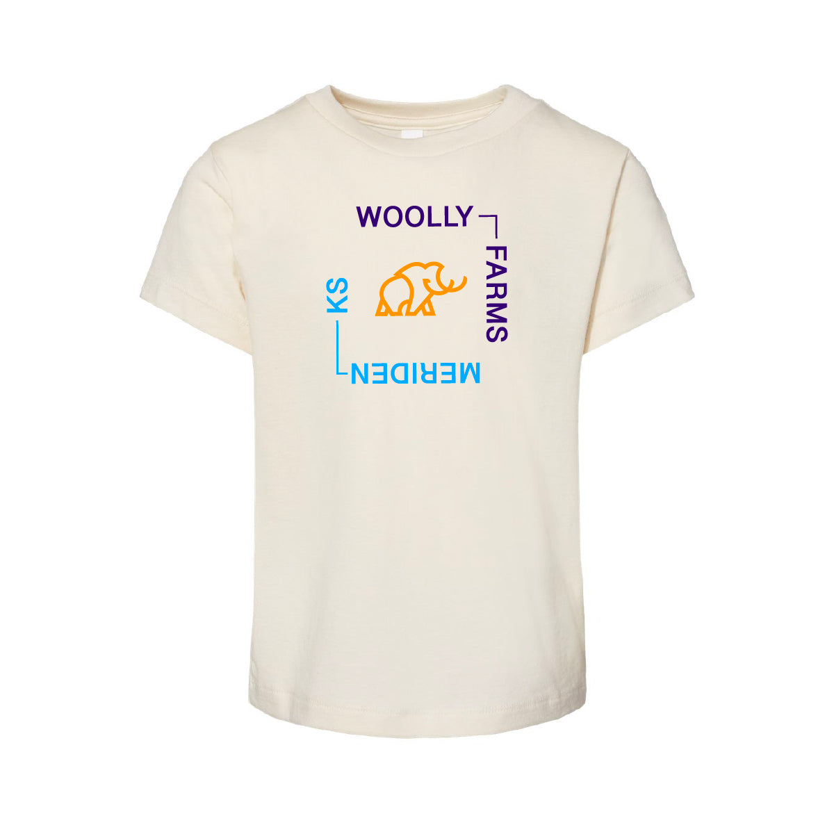 This youth t-shirt comes in a natural color, and features a fun variation of the Woolly Farms logo.