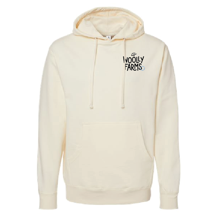 This bone colored Independent Trading Co. Midweight Hooded Sweatshirt comes in adult sizes and features the new Woolly logo on the front and the colorful Woolly artwork on the back. It is an 80/20 ring-spun cotton/poly blend fleece with 100% cotton face. It comes in a classic fit with a jersey lined hood, a pouch pocket, and metal eyelets.