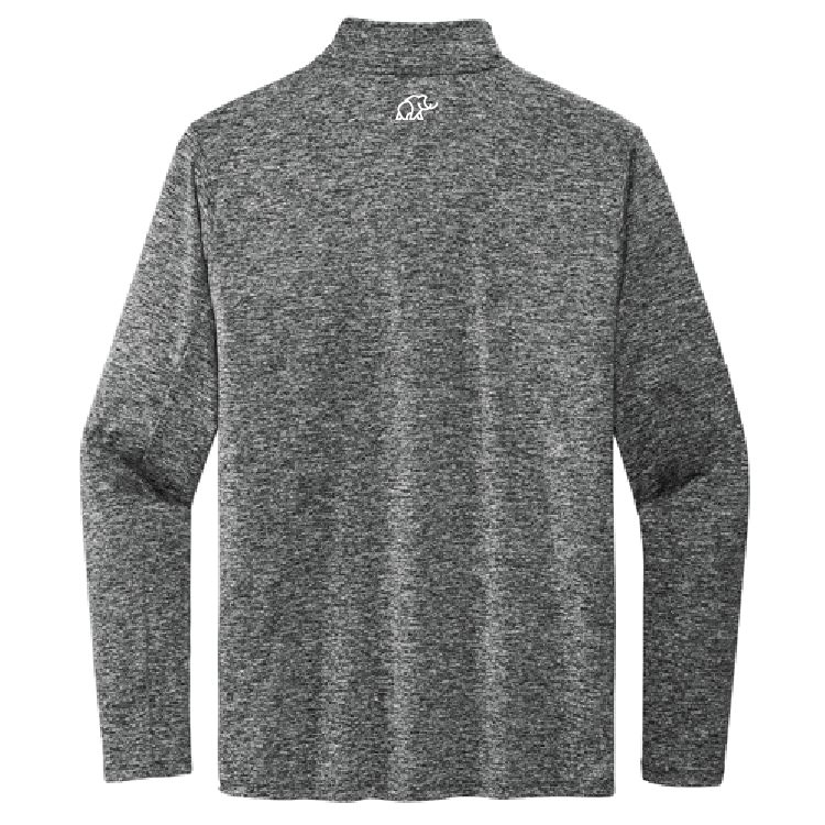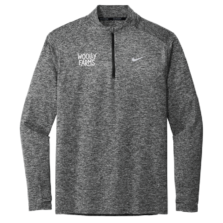 This black heather Nike Dri-FIT Element 1/2-Zip Top in adult sizes features the Woolly Farms text logo embroidered in white on the right chest and the icon embroidered under the collar on the back. It is a 88/12 polyester/spandex jersey Dri-FIT fabric that has sweat-wicking properties. It has a stand-up collar, thumbholes, and drop tail hem.